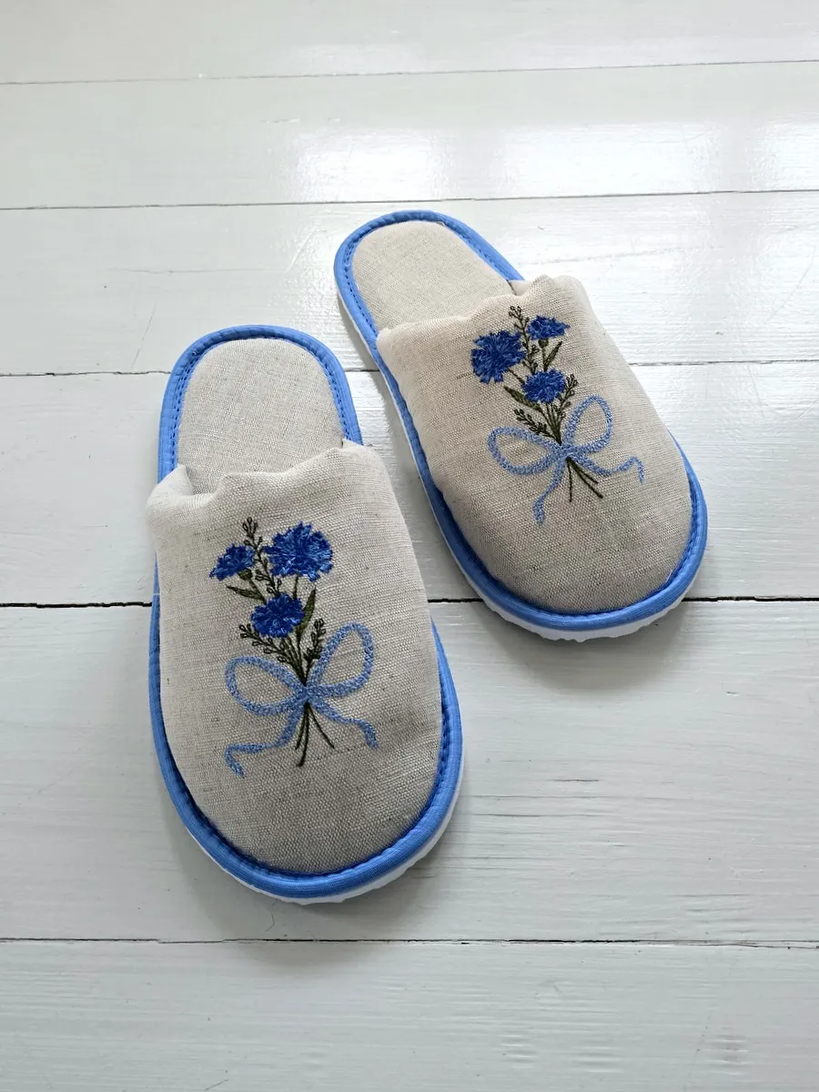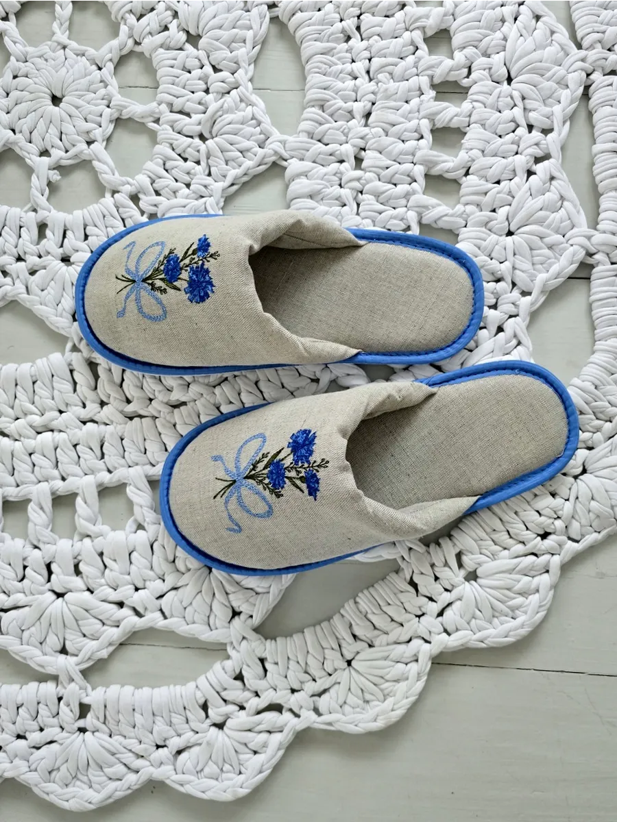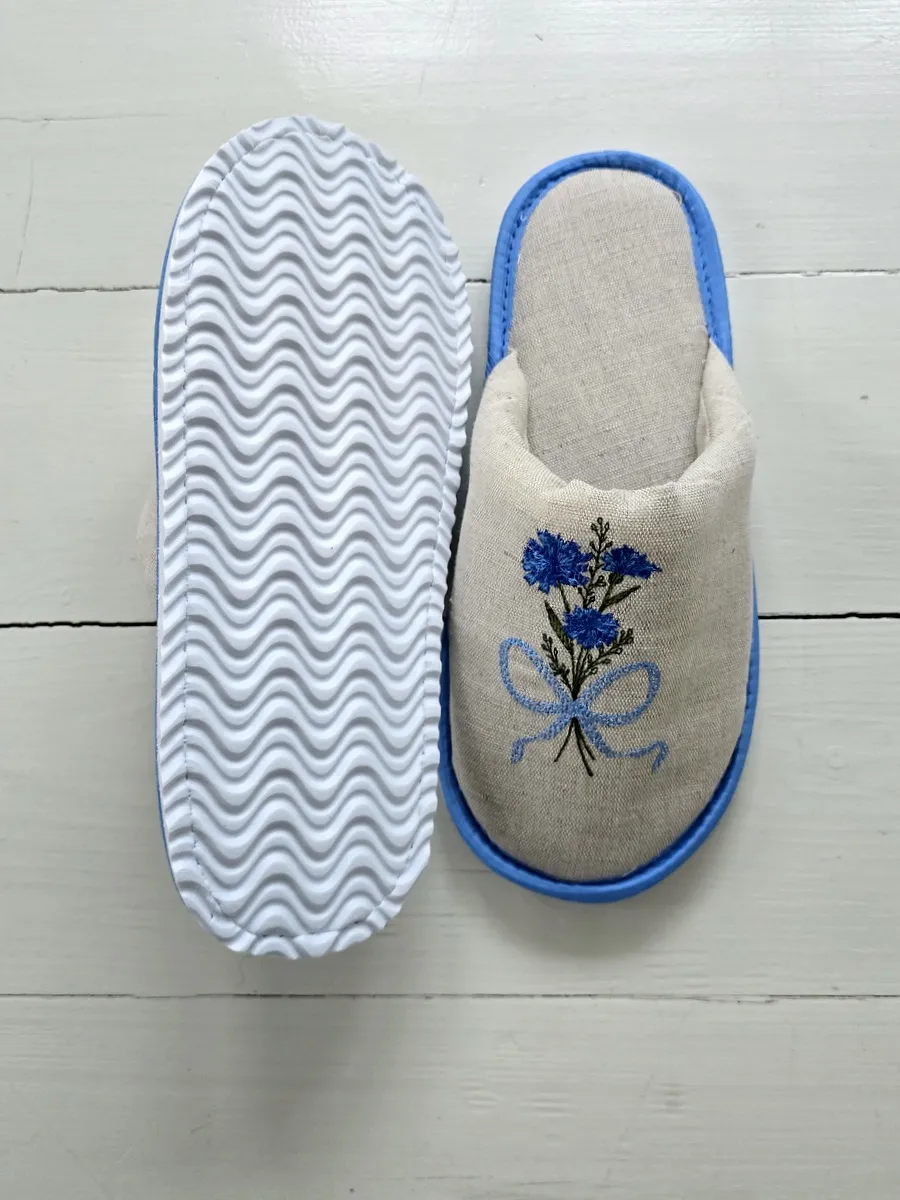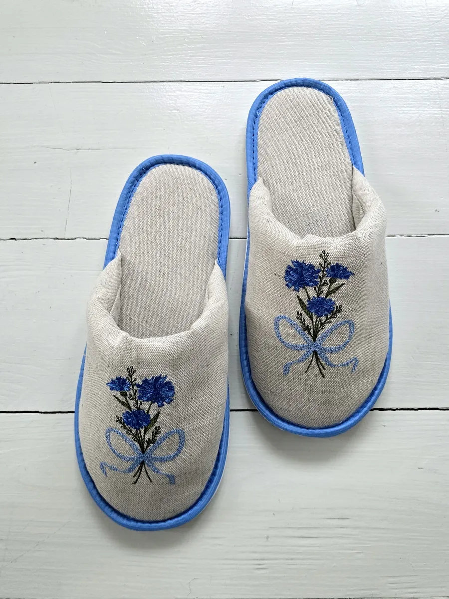 Красивые дизайнерские льняные тапочки с вышивкой Васильки. Аккуратные и элегантные женские домашние тапочки. Легкие, экологичные и очень комфортные!