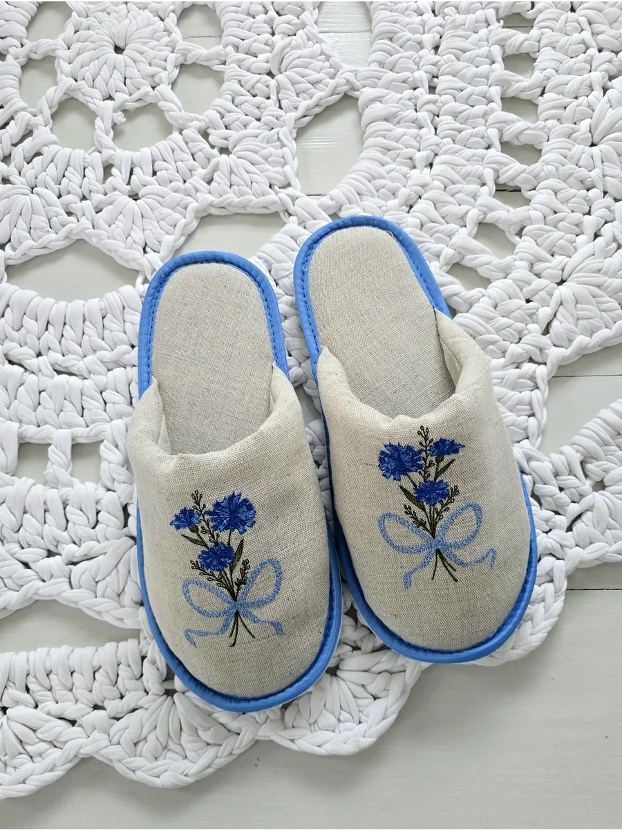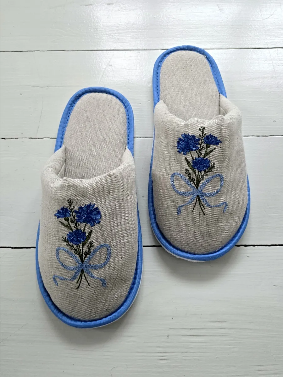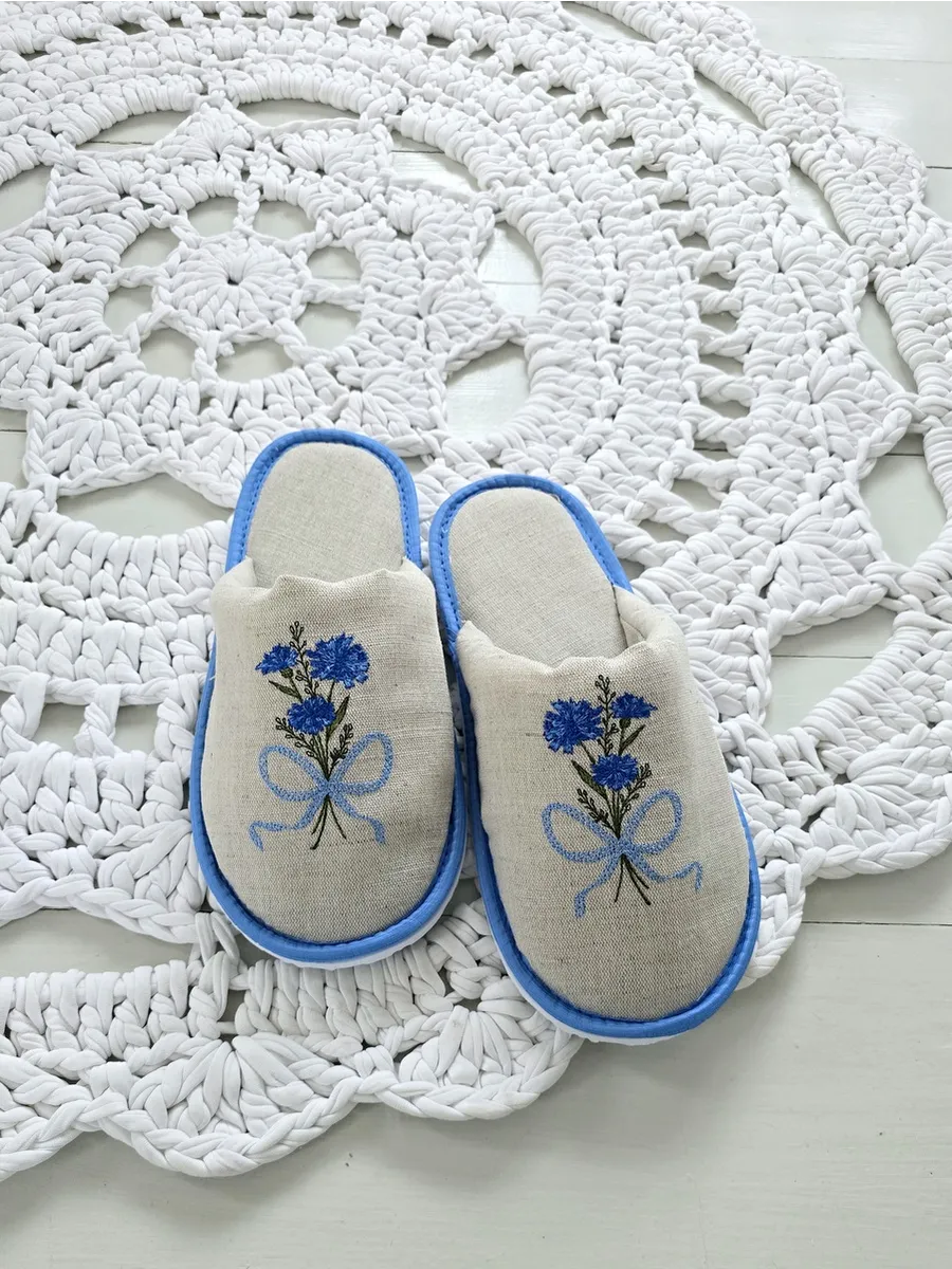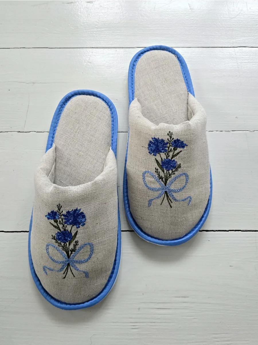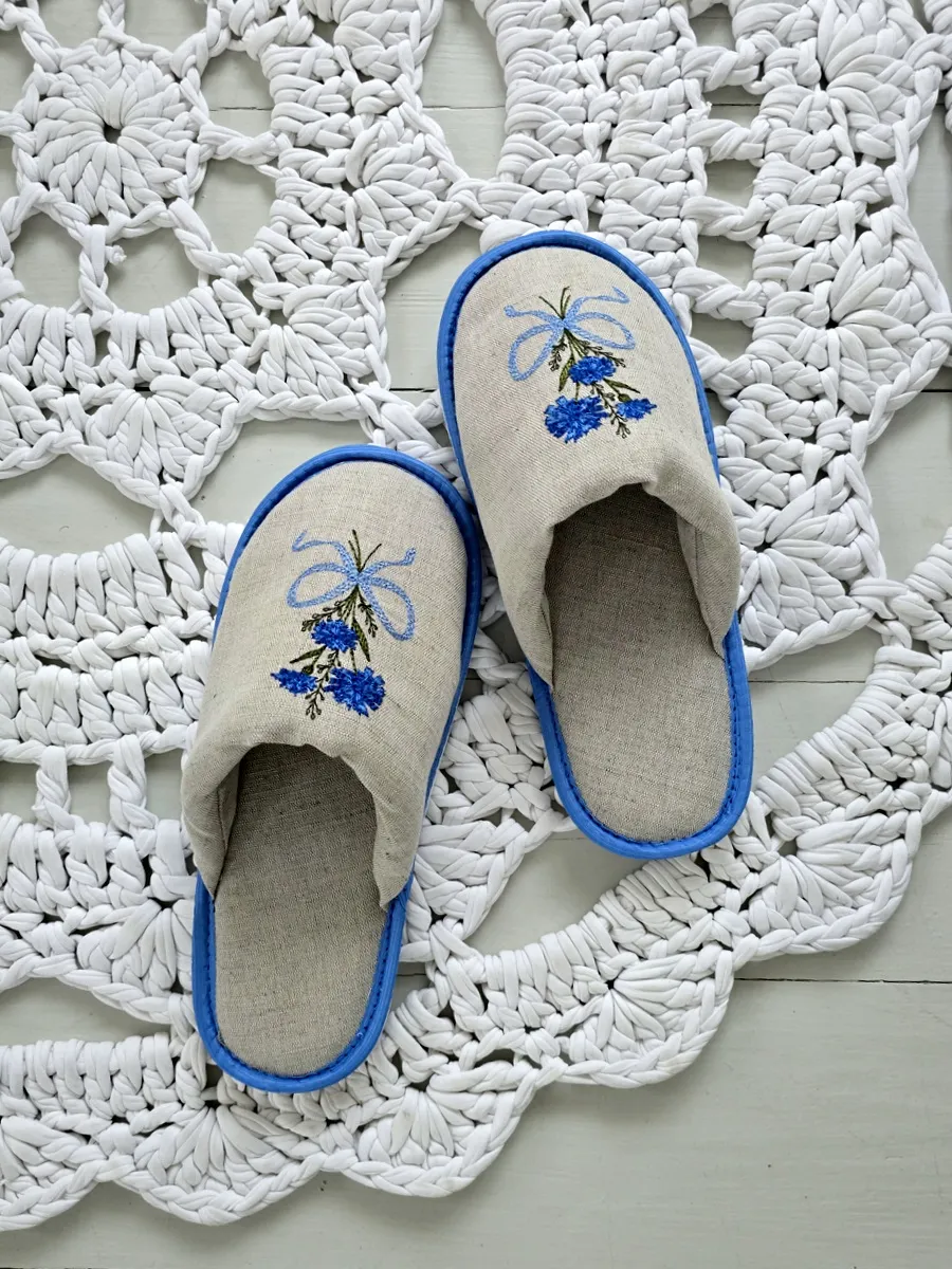 Красивые дизайнерские льняные тапочки с вышивкой Васильки. Аккуратные и элегантные женские домашние тапочки. Легкие, экологичные и очень комфортные!