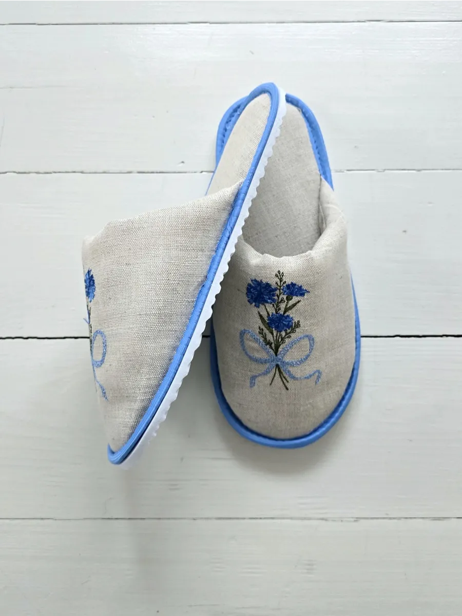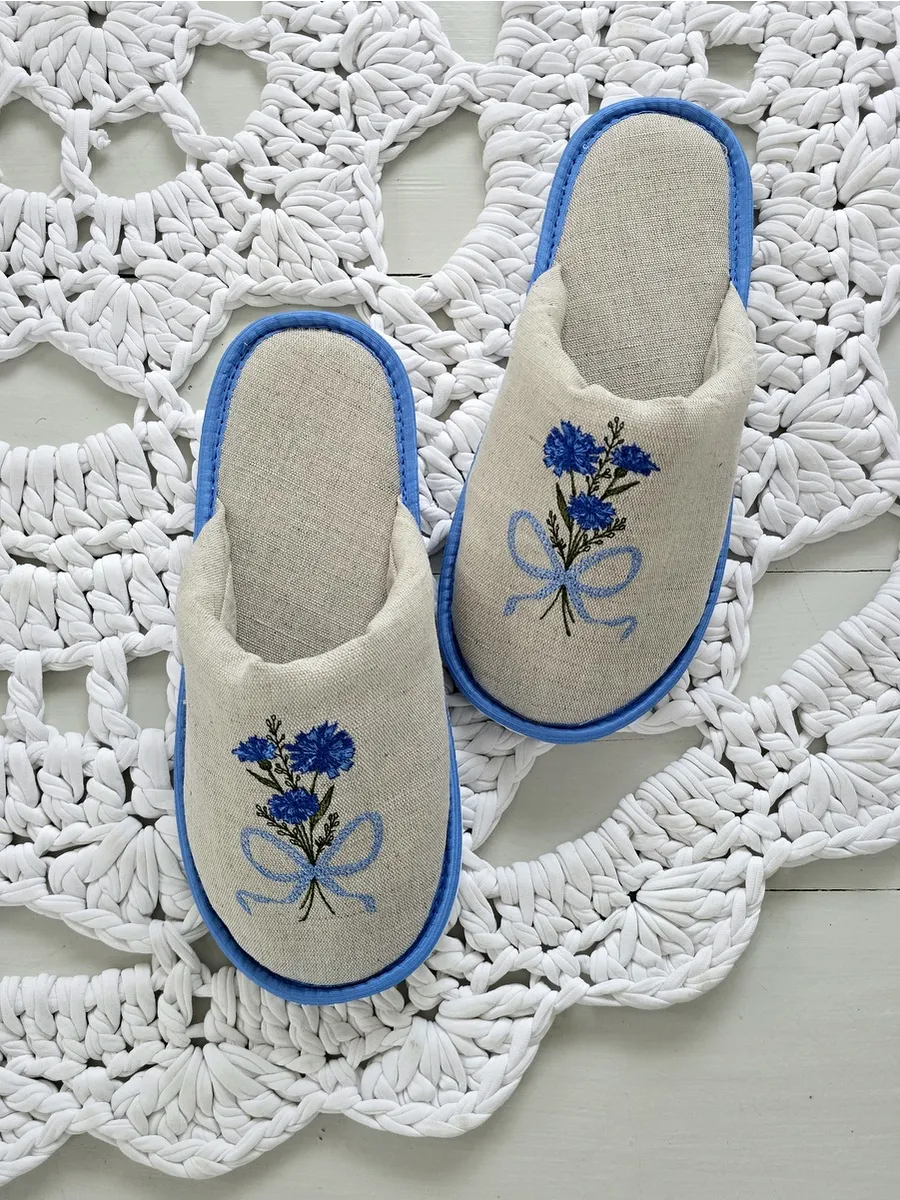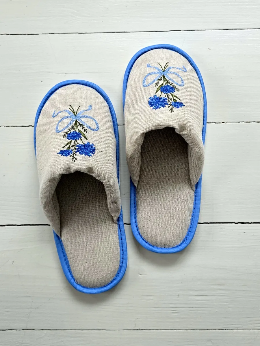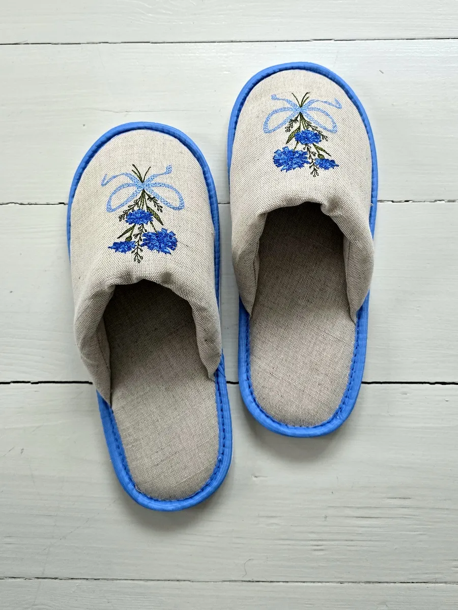 Красивые дизайнерские льняные тапочки с вышивкой Васильки. Аккуратные и элегантные женские домашние тапочки. Легкие, экологичные и очень комфортные!