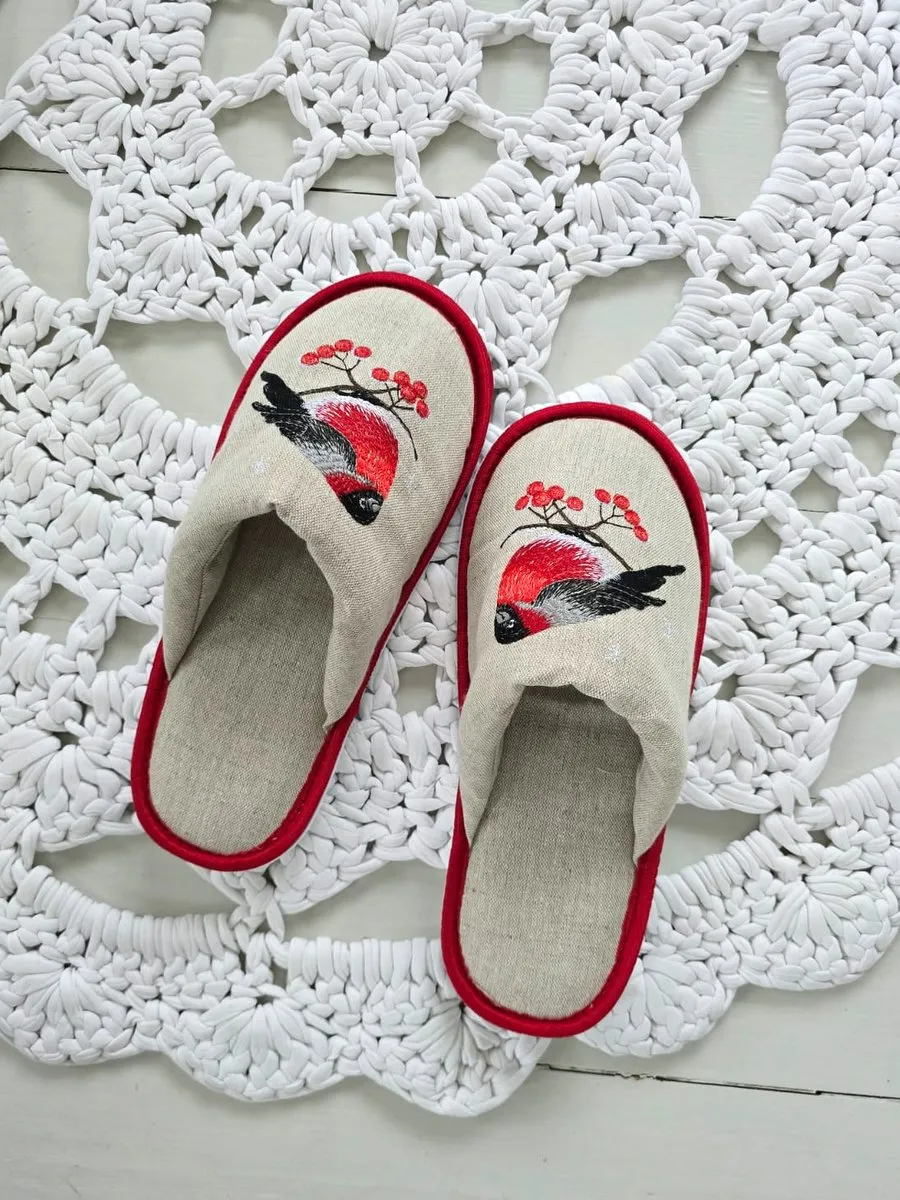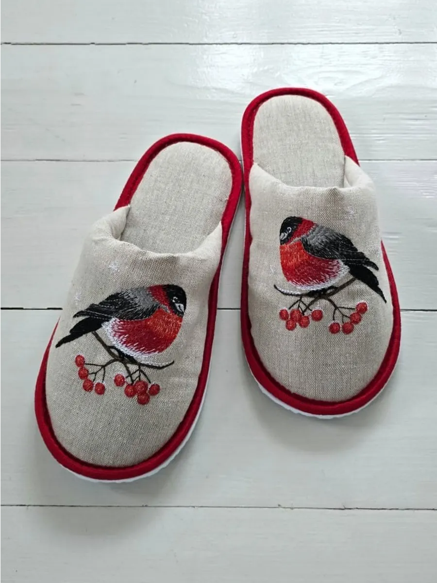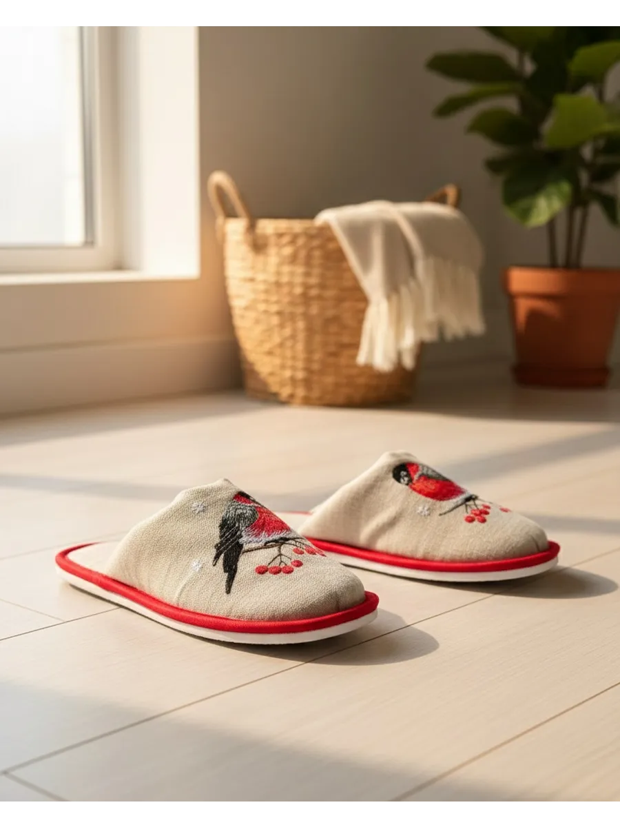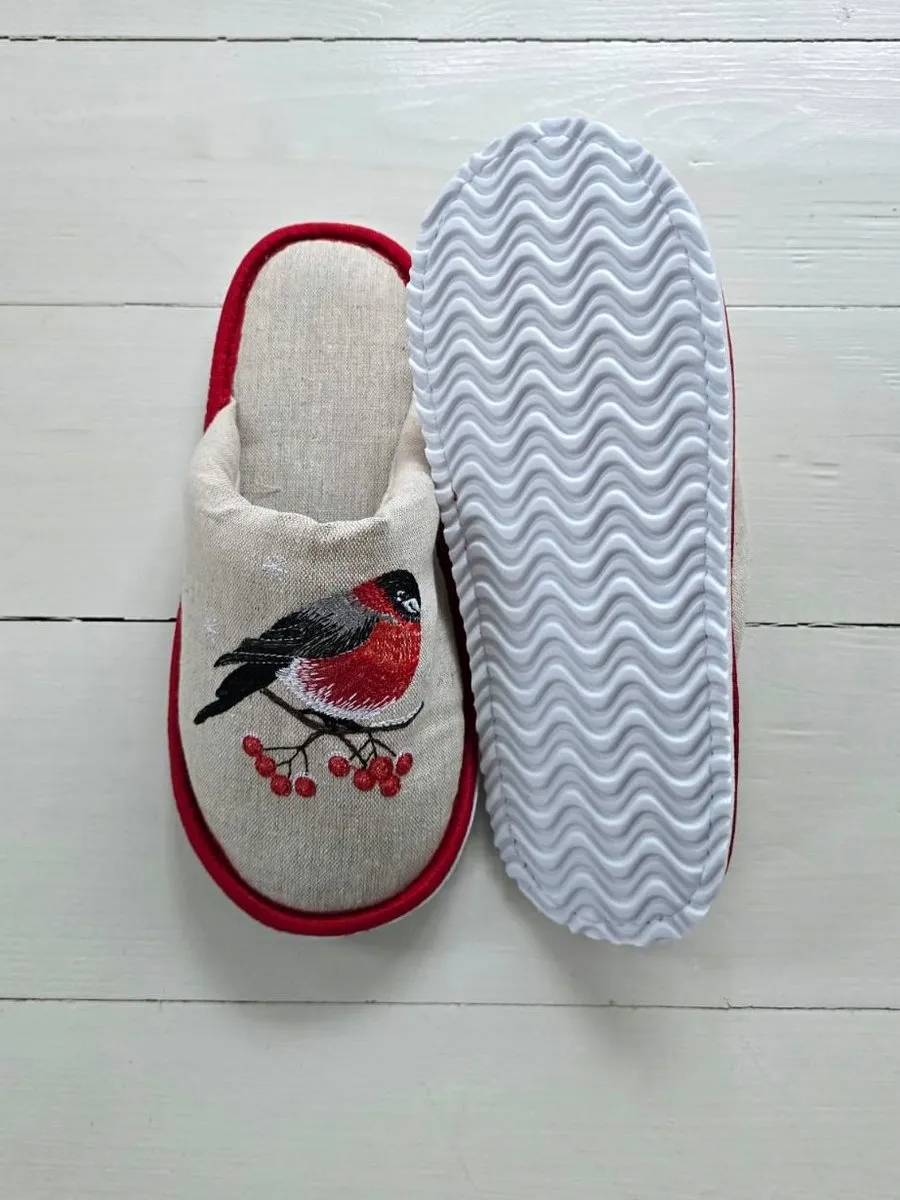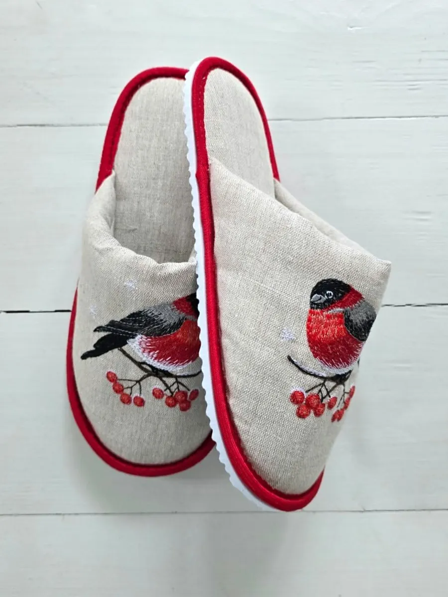 Наши тапочки выполнены из 100% натурального льна – это гарантия свежести и комфорта для ваших ног. Детально проработанные снегири на ветке рябины станут ярким акцентом в вашем домашнем образе.