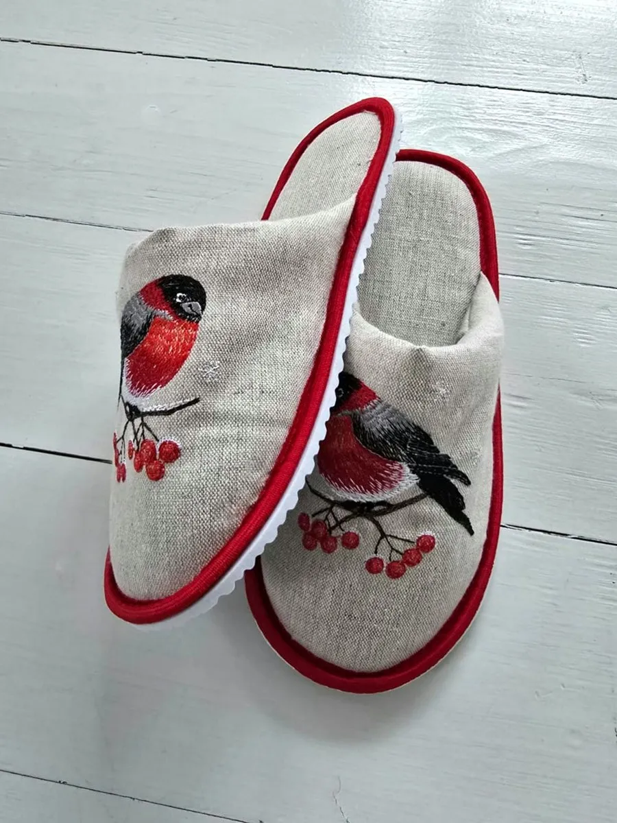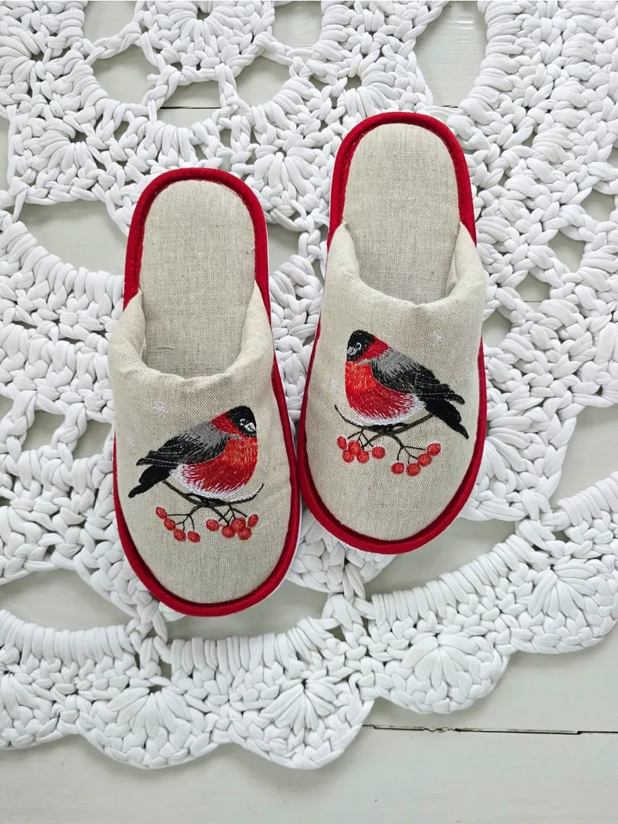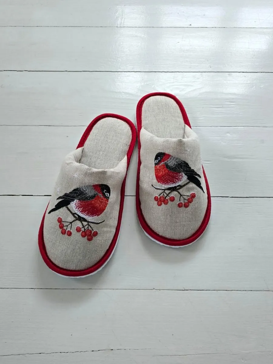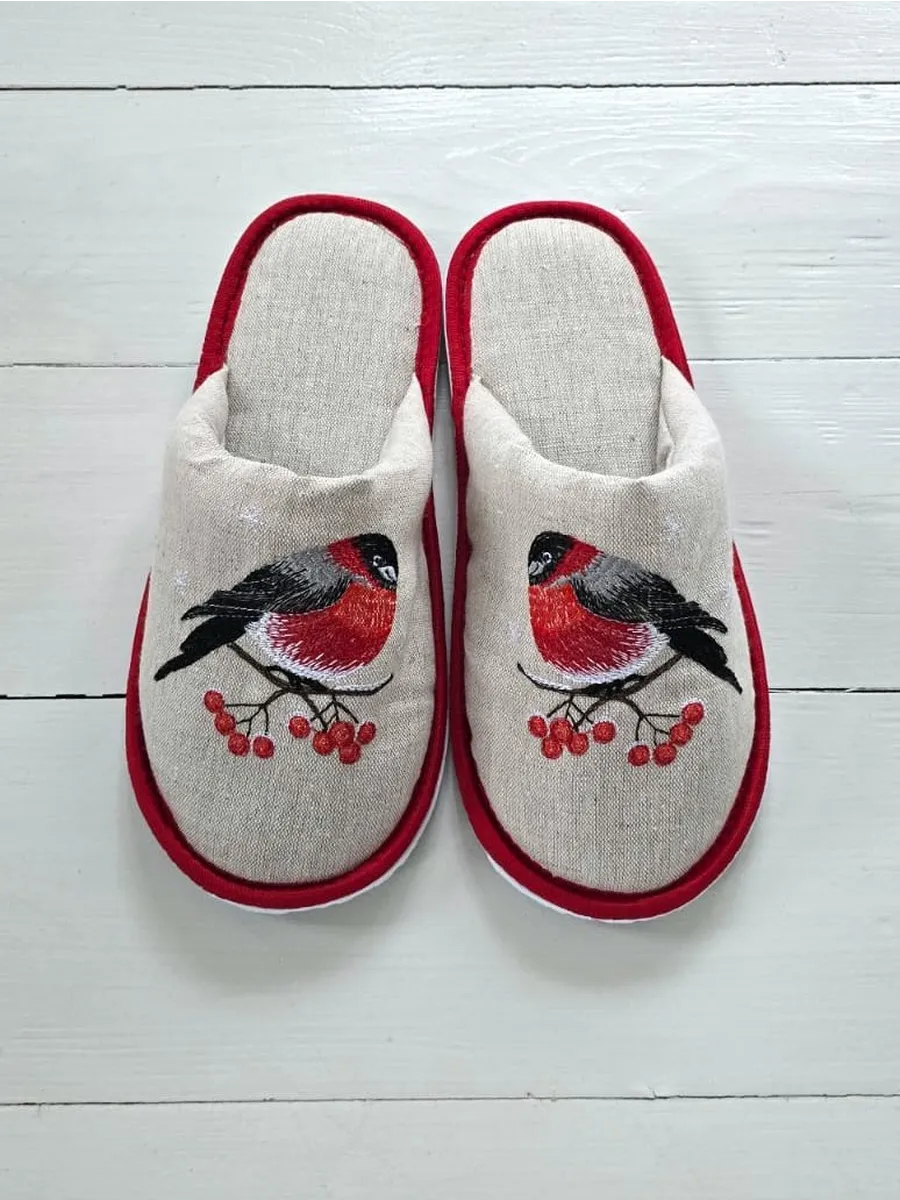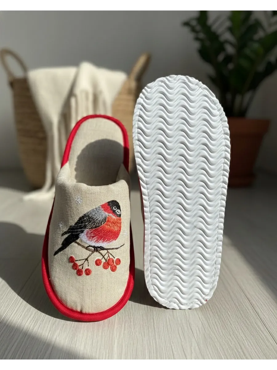 Наши тапочки выполнены из 100% натурального льна – это гарантия свежести и комфорта для ваших ног. Детально проработанные снегири на ветке рябины станут ярким акцентом в вашем домашнем образе.
