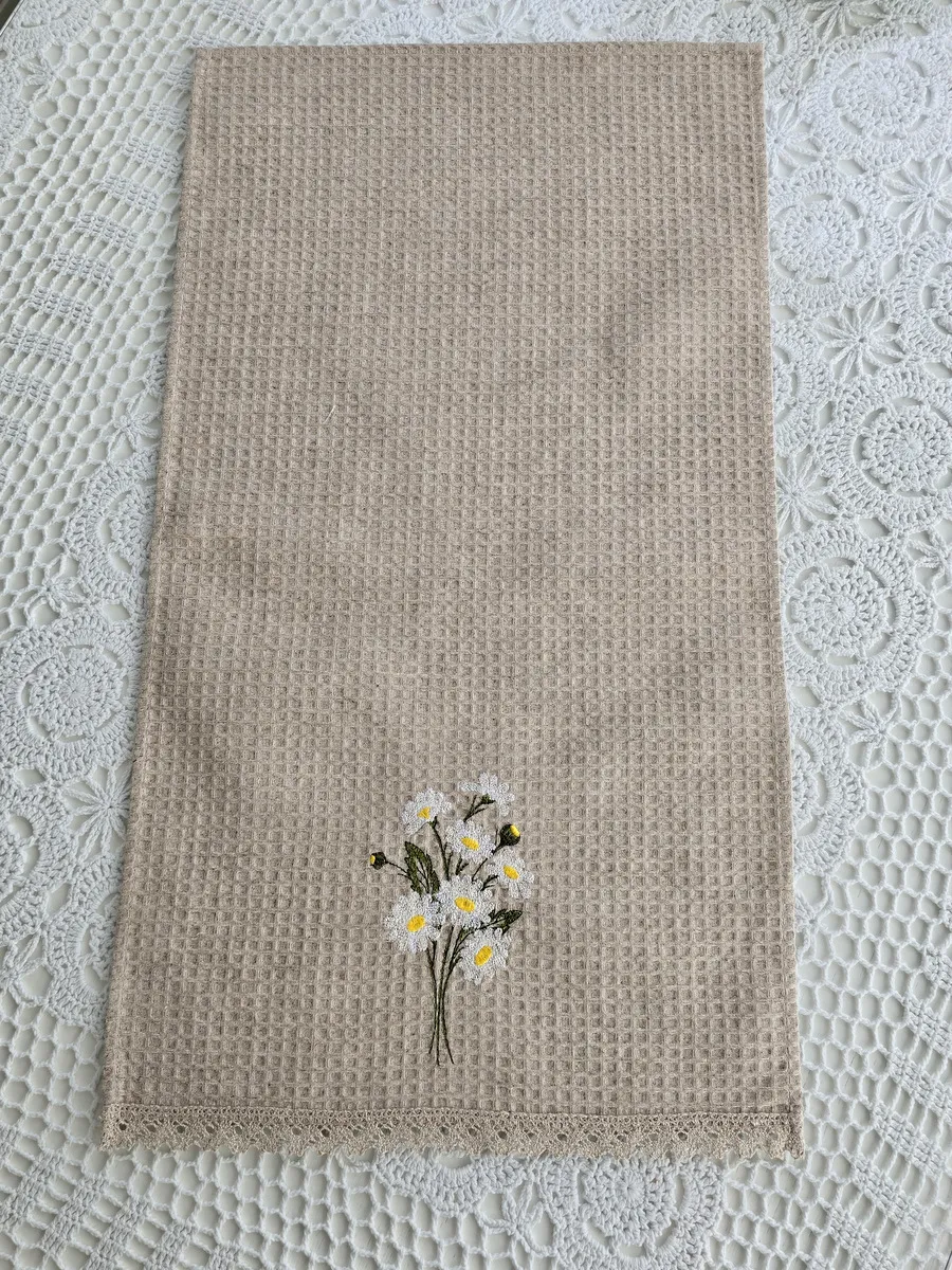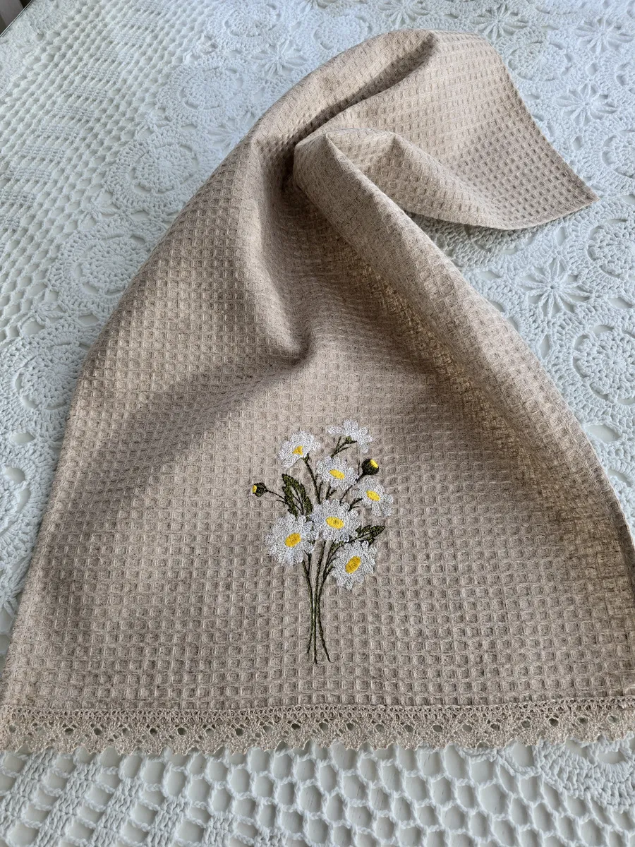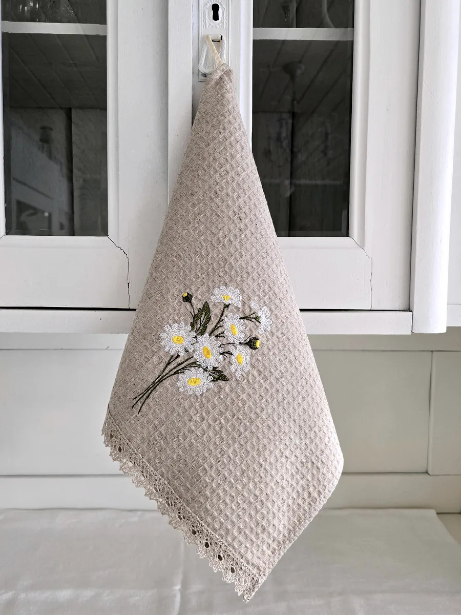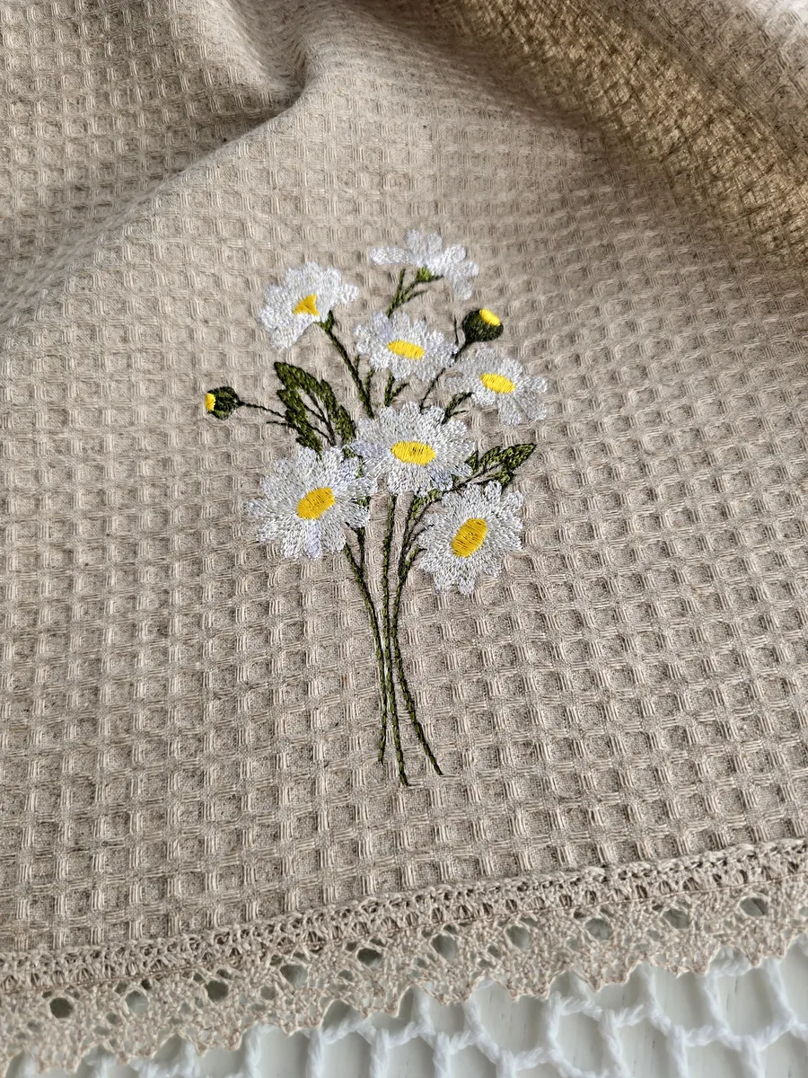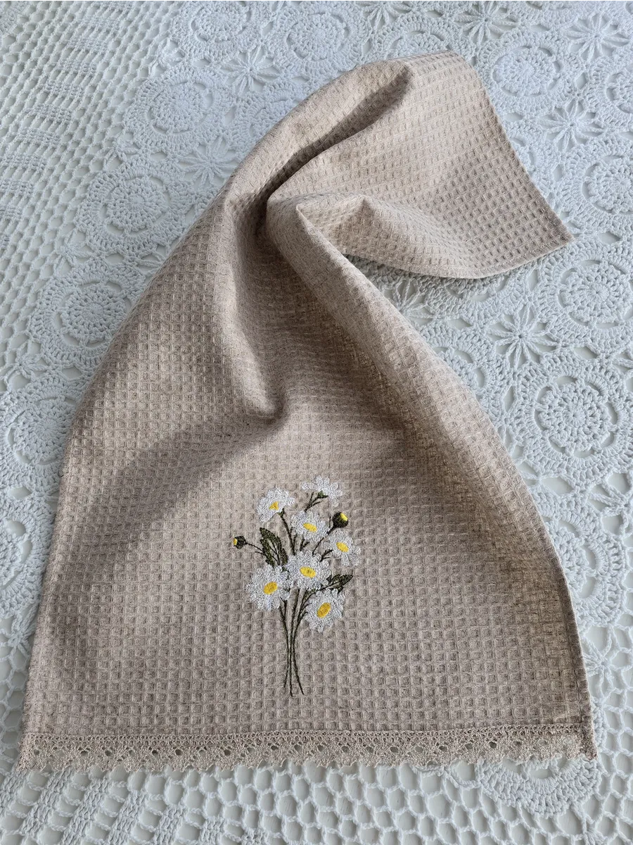 Представляем Вам дизайнерское льняное вафельное полотенце с вышивкой "Ромашки".