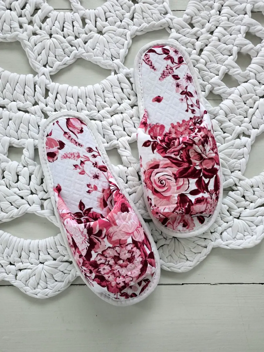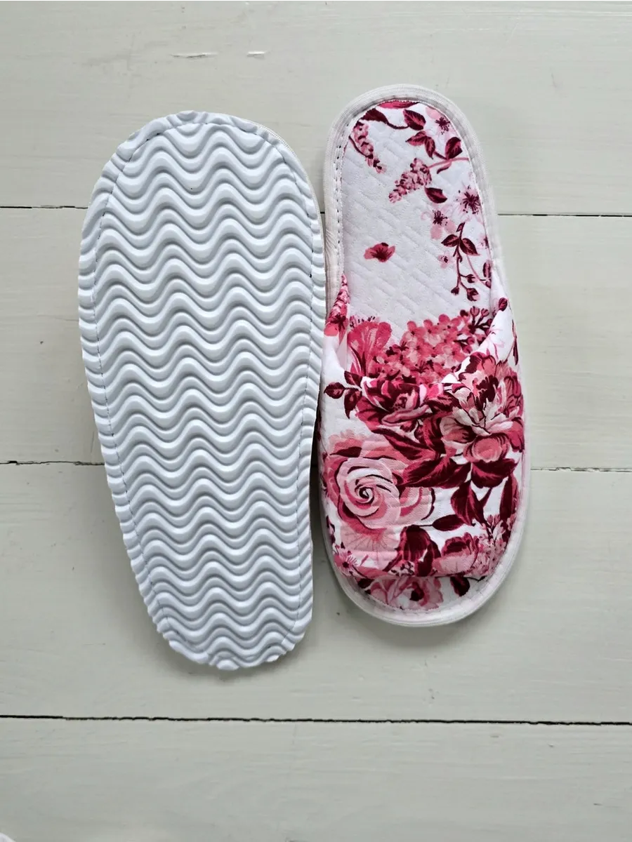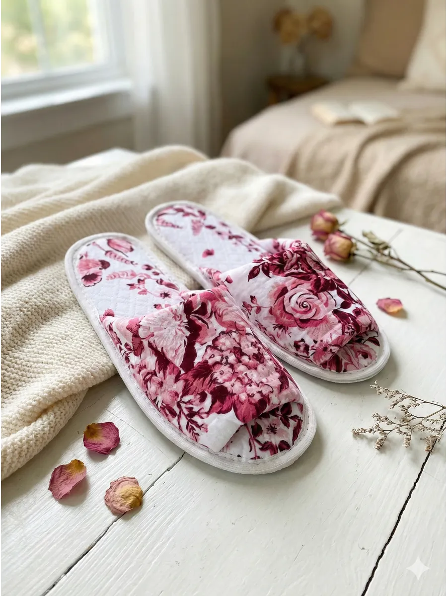 - **Дизайн:** Цветочный принт с розами и листьями, придающий тапочкам элегантный и стильный вид
