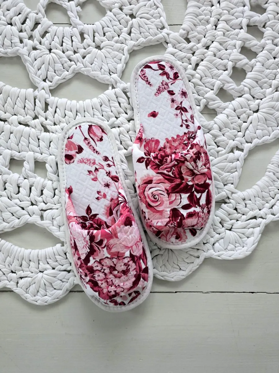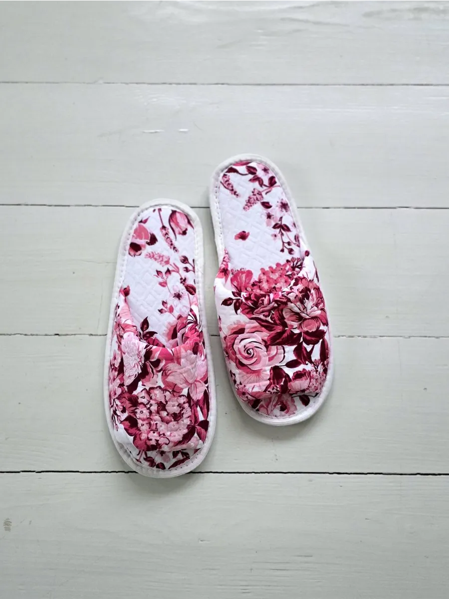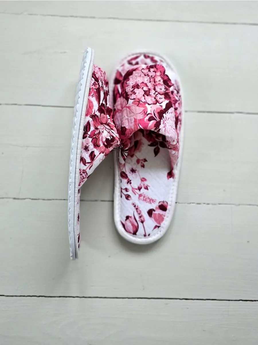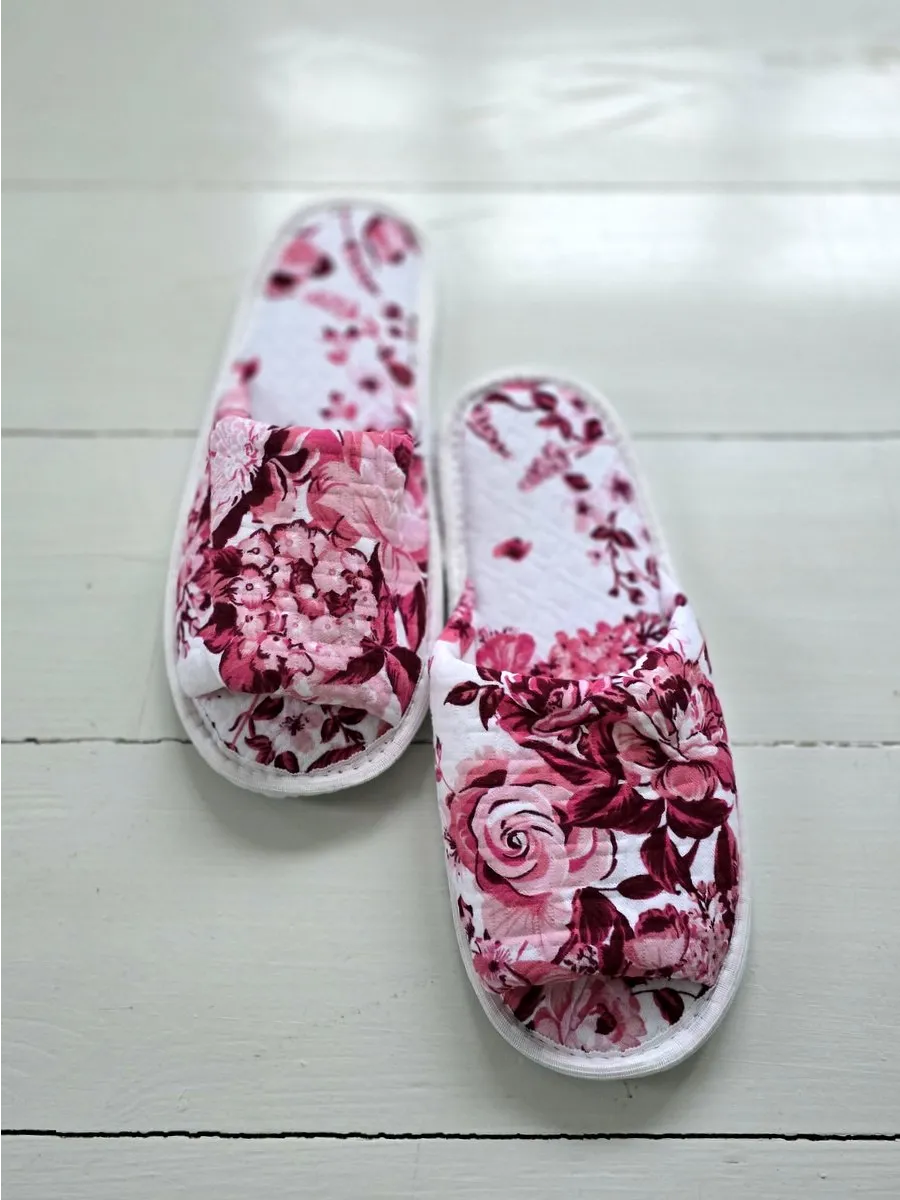 - **Дизайн:** Цветочный принт с розами и листьями, придающий тапочкам элегантный и стильный вид