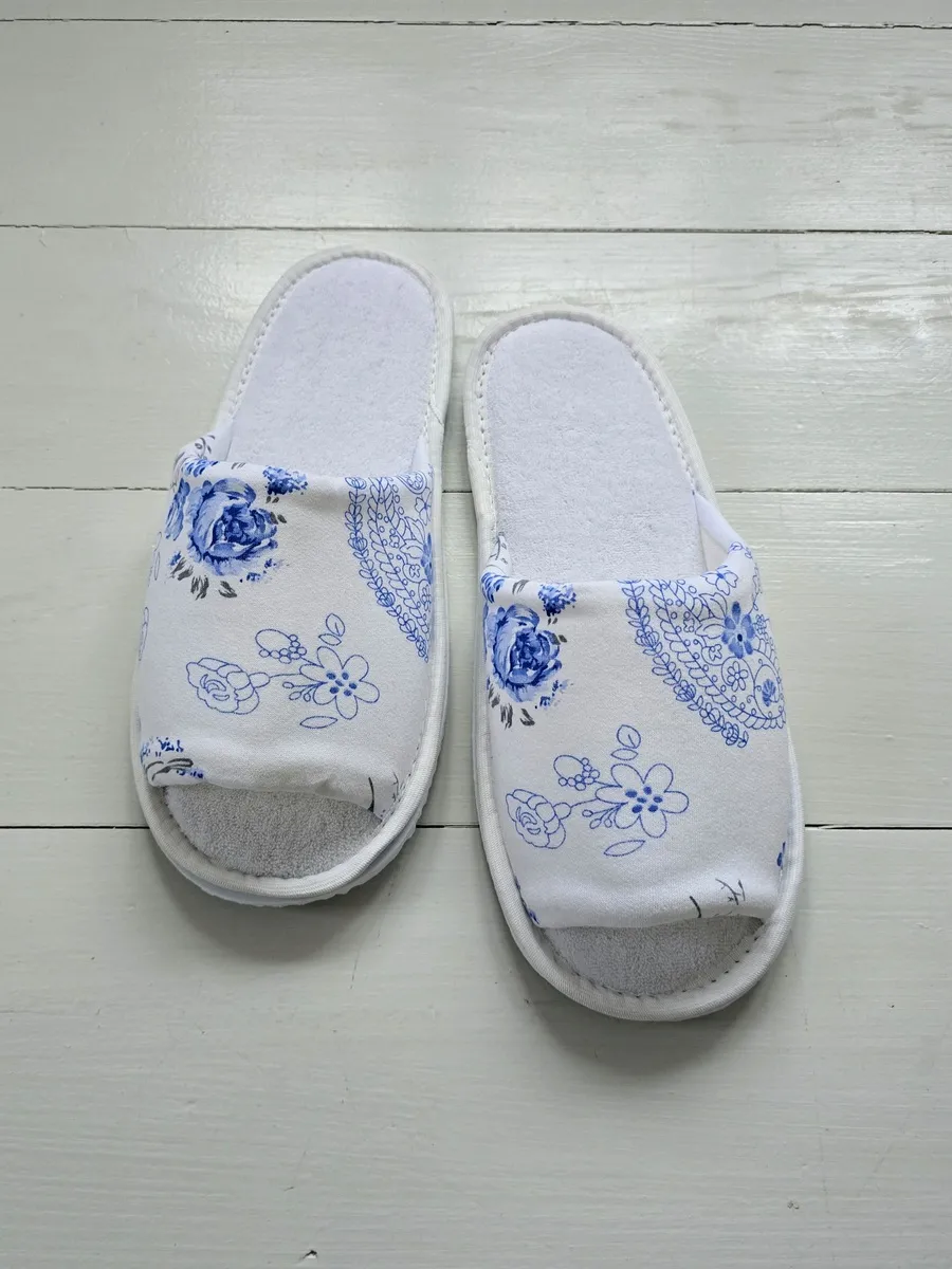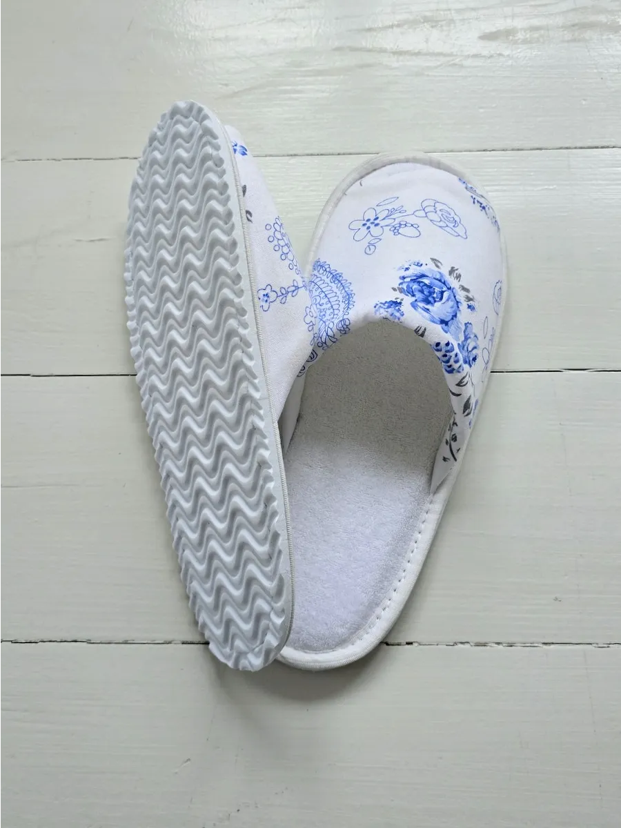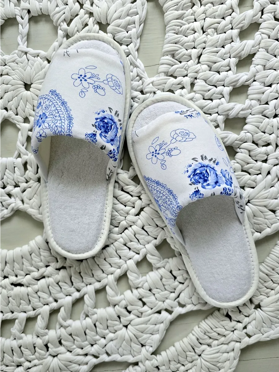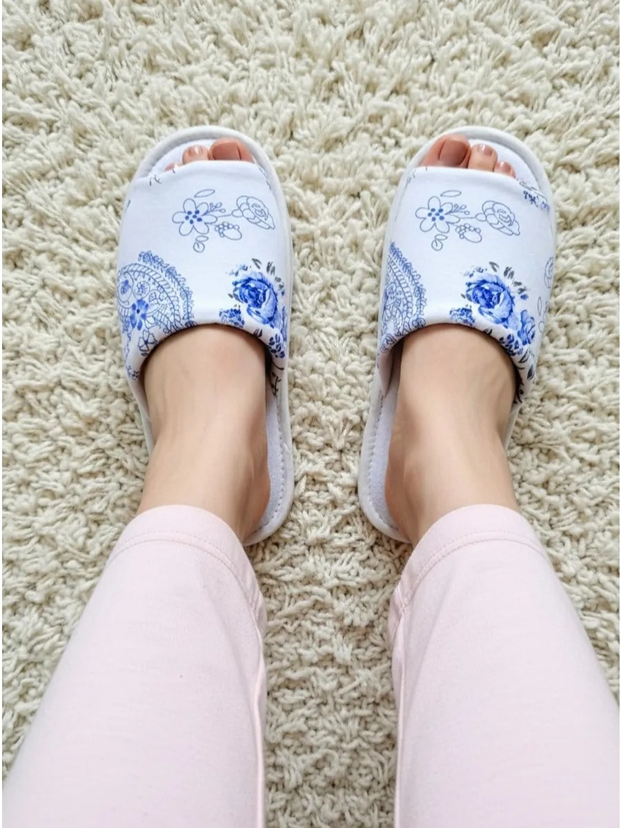 - **Дизайн:** Цветочный принт с розами и листьями, придающий тапочкам элегантный и стильный вид