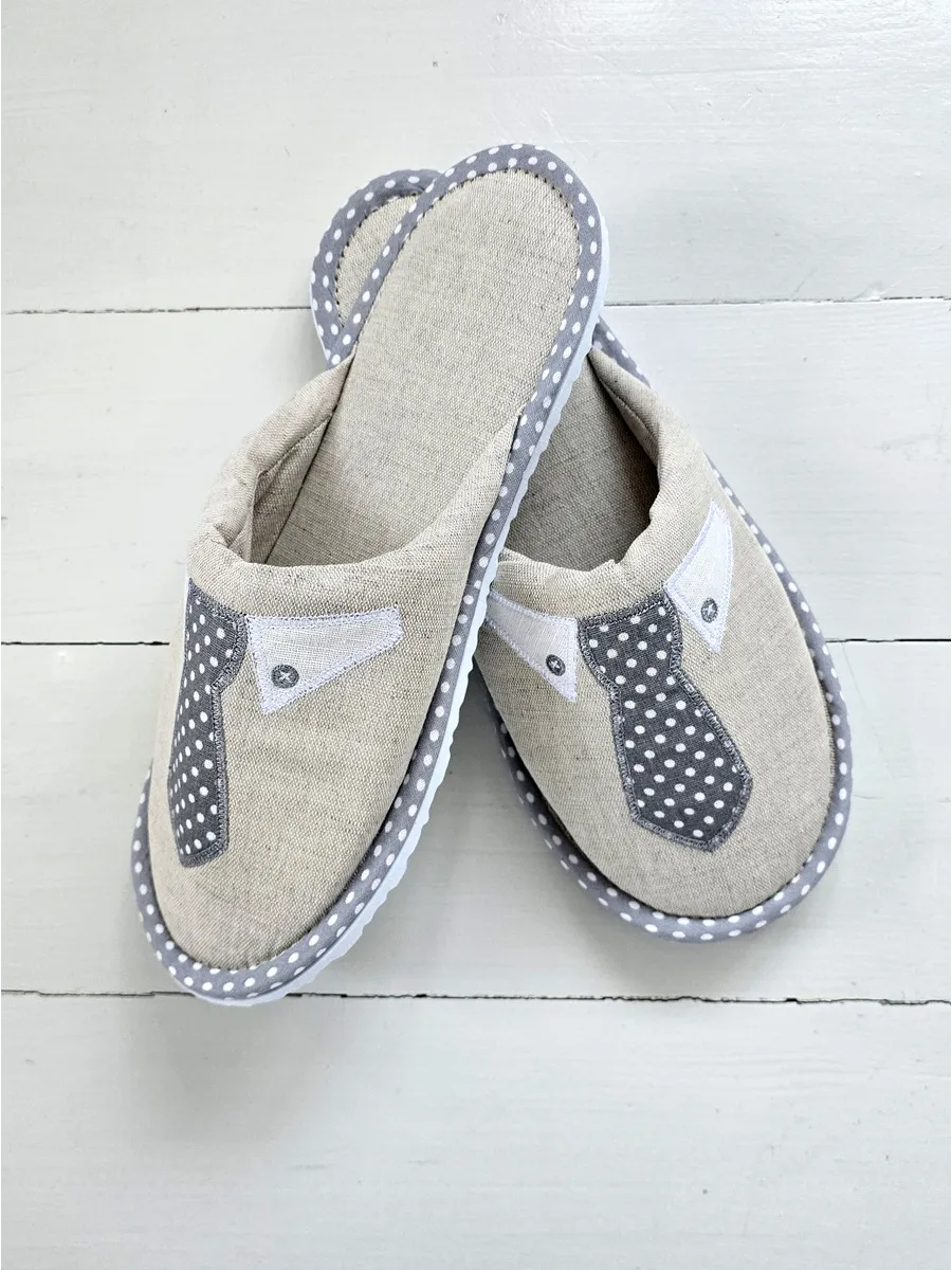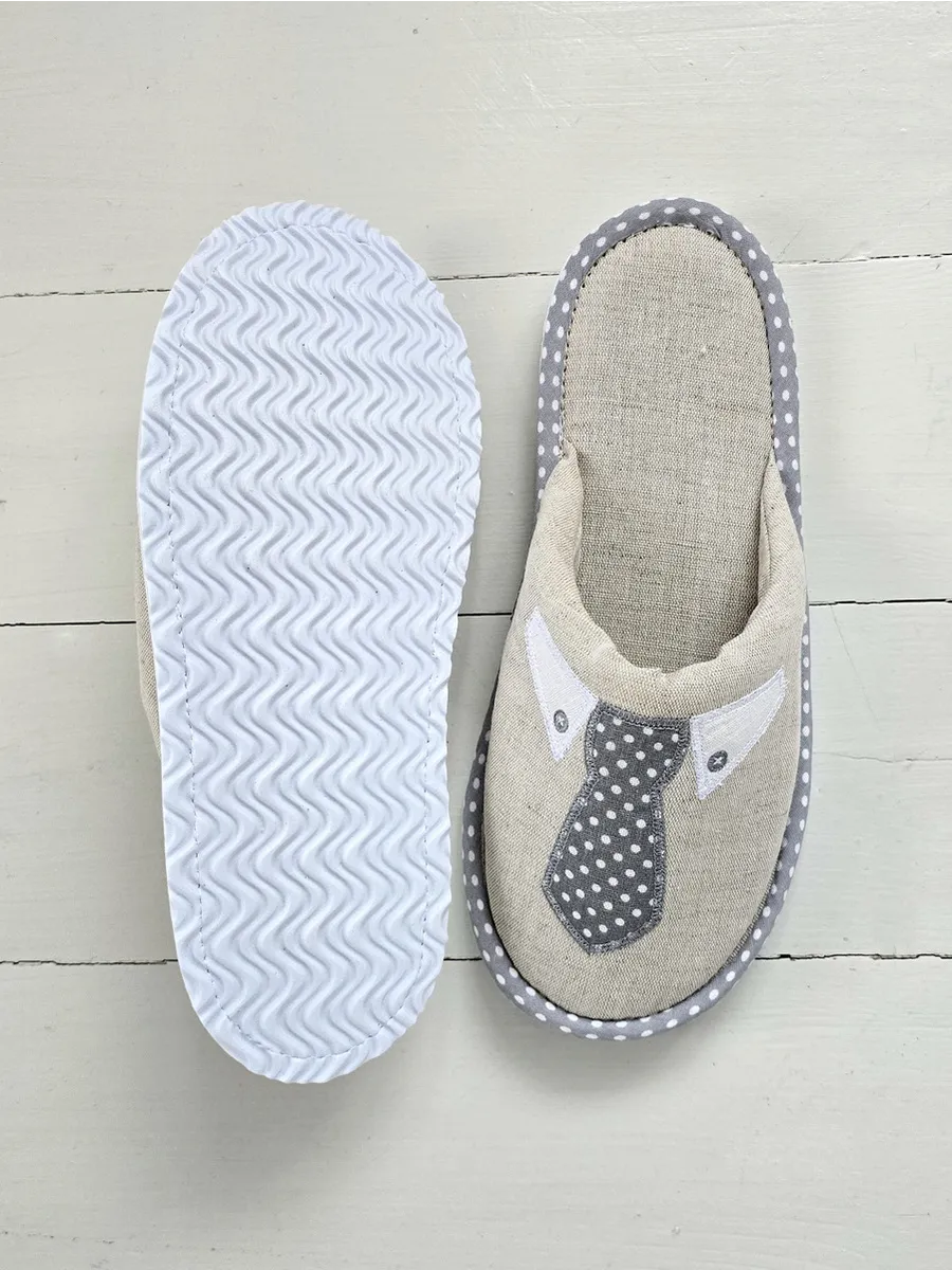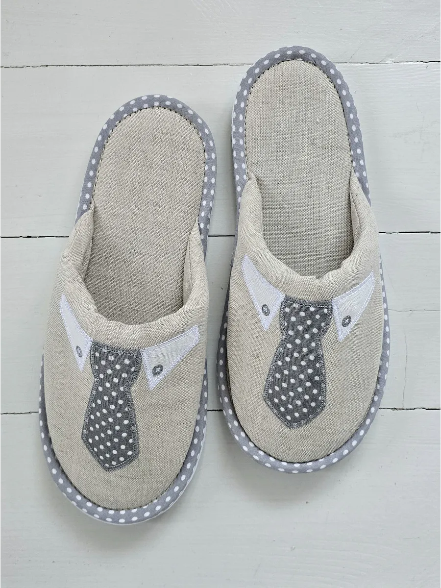 Эти уютные льняные тапочки с вышивкой "Галстук" станут прекрасным подарком для любимого мужчины. Аккуратные элегантные мужские домашние тапочки. Изготовленные из натурального льна и хлопка, они подарят ногам комфорт и приятные тактильные ощущения. Закрытый мысок и открытая пятка обеспечивают удобную посадку и хорошую вентиляцию, а плоская подошва высотой всего 0,6 см делает их идеальными для домашнего использования. Льняные тапочки - это не просто сувенир, это проявление заботы и внимания к близкому человеку. Они экологичны, приятны на ощупь и создадут атмосферу уюта в доме. Подарите папе, другу или брату этот милый и практичный подарок, который будет напоминать о вашей любви и заботе.